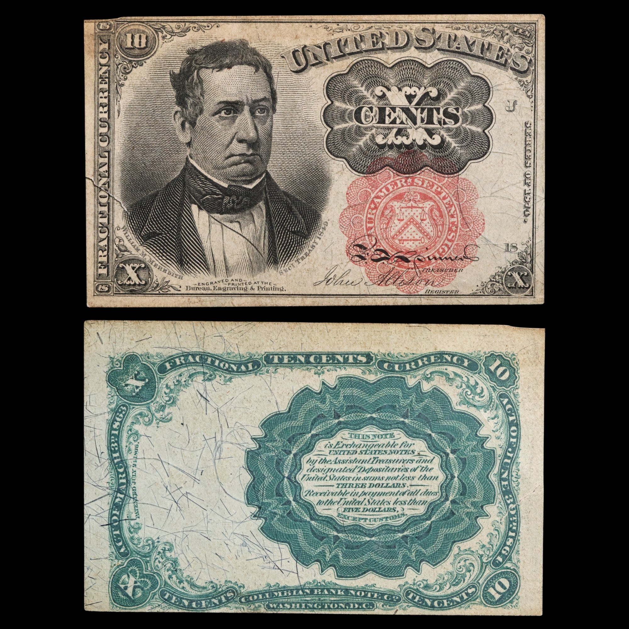 • Face Side: Fractional Currency – United States – X Cents – Series of 1874 – William M. Meredith – Secy Treasy 1849 – Engraved and Printed At The Bureau, Engraving & Printing – Register – Treasurer - Portrait of William M. Meredith (former Secretary of the Treasury) with a red seal