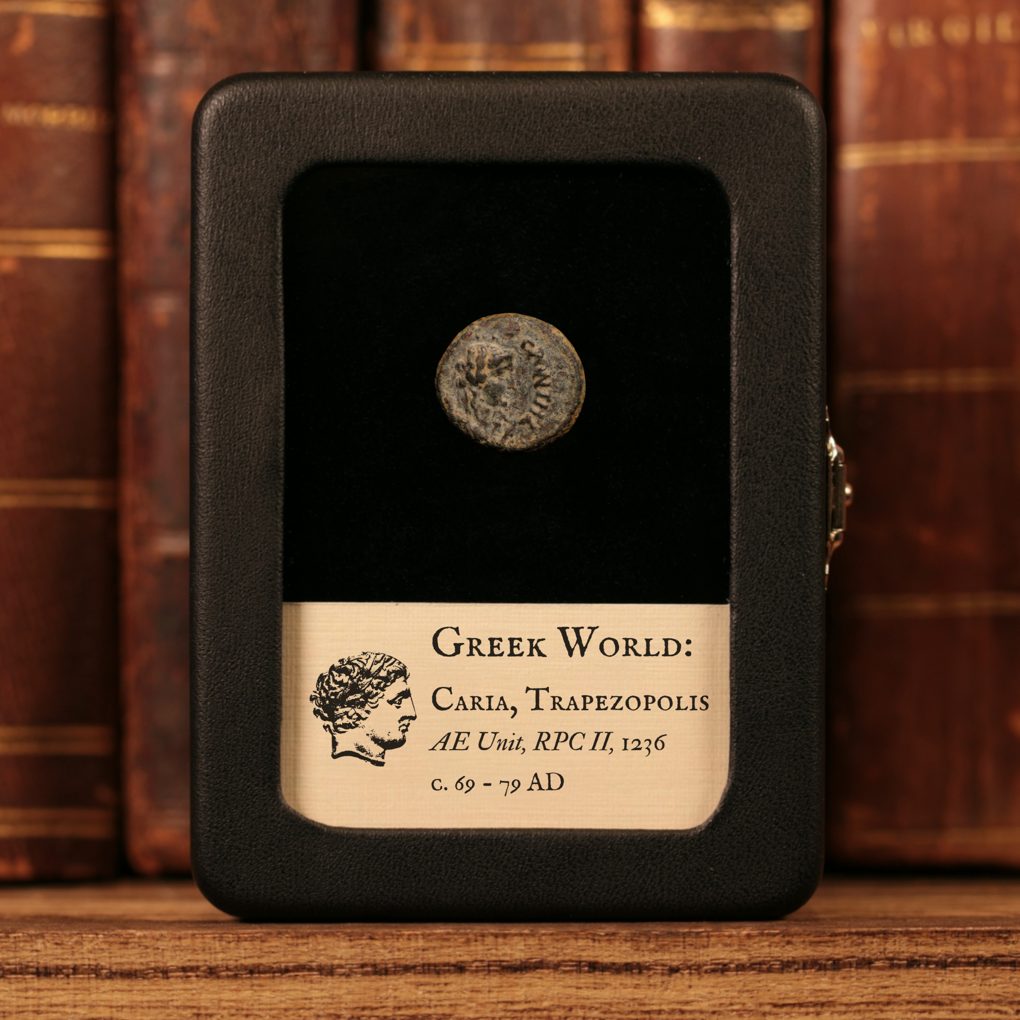 Our original glass and leatherette display boxes showcase your relic above a custom information card, with a design unique to History Hoard.