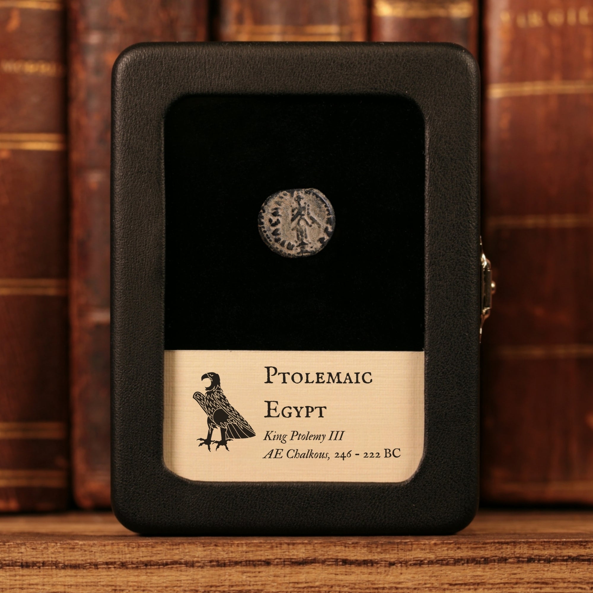 Our original glass and leatherette display boxes showcase your relic above a custom information card, with a design unique to History Hoard.