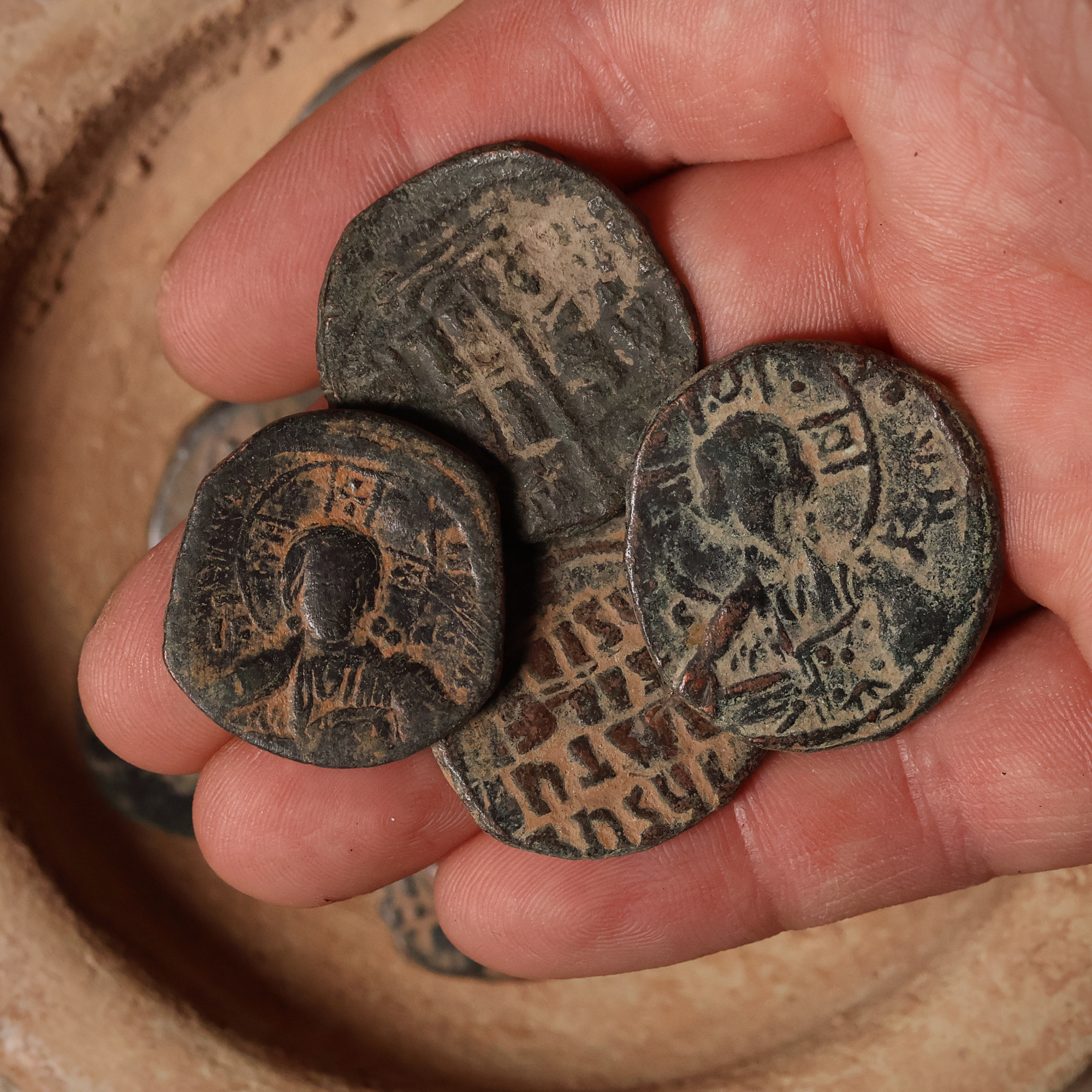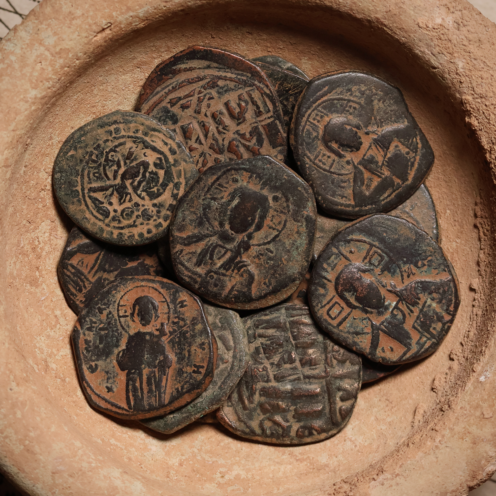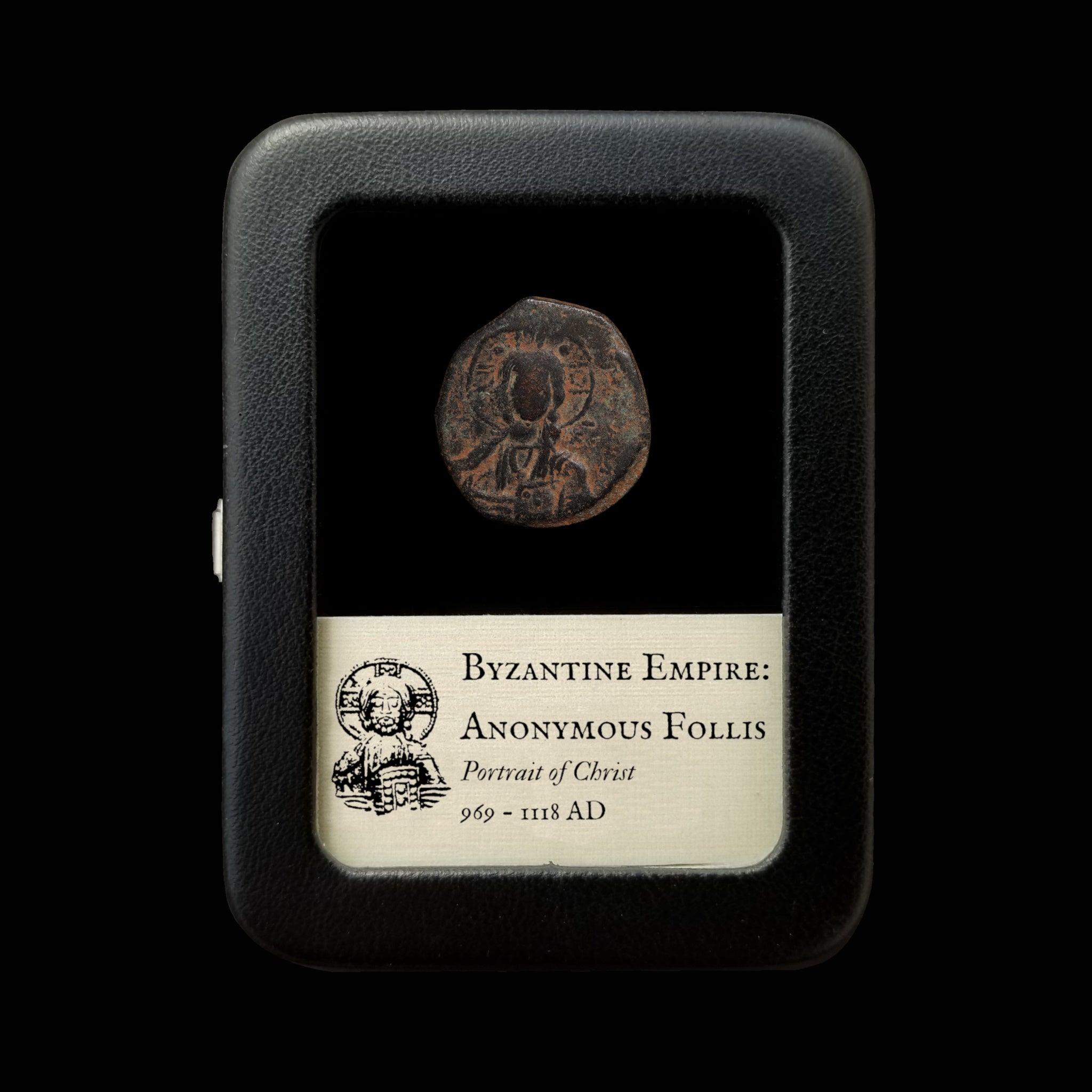 These bronze coins of the Byzantine Empire were issued anonymously under various emperors, with the usual imperial portraits being replaced by a portrait of Jesus Christ. Collectively, these issues are known as anonymous Byzantine folles—“follis” being the denomination, with “folles” as its plural form.