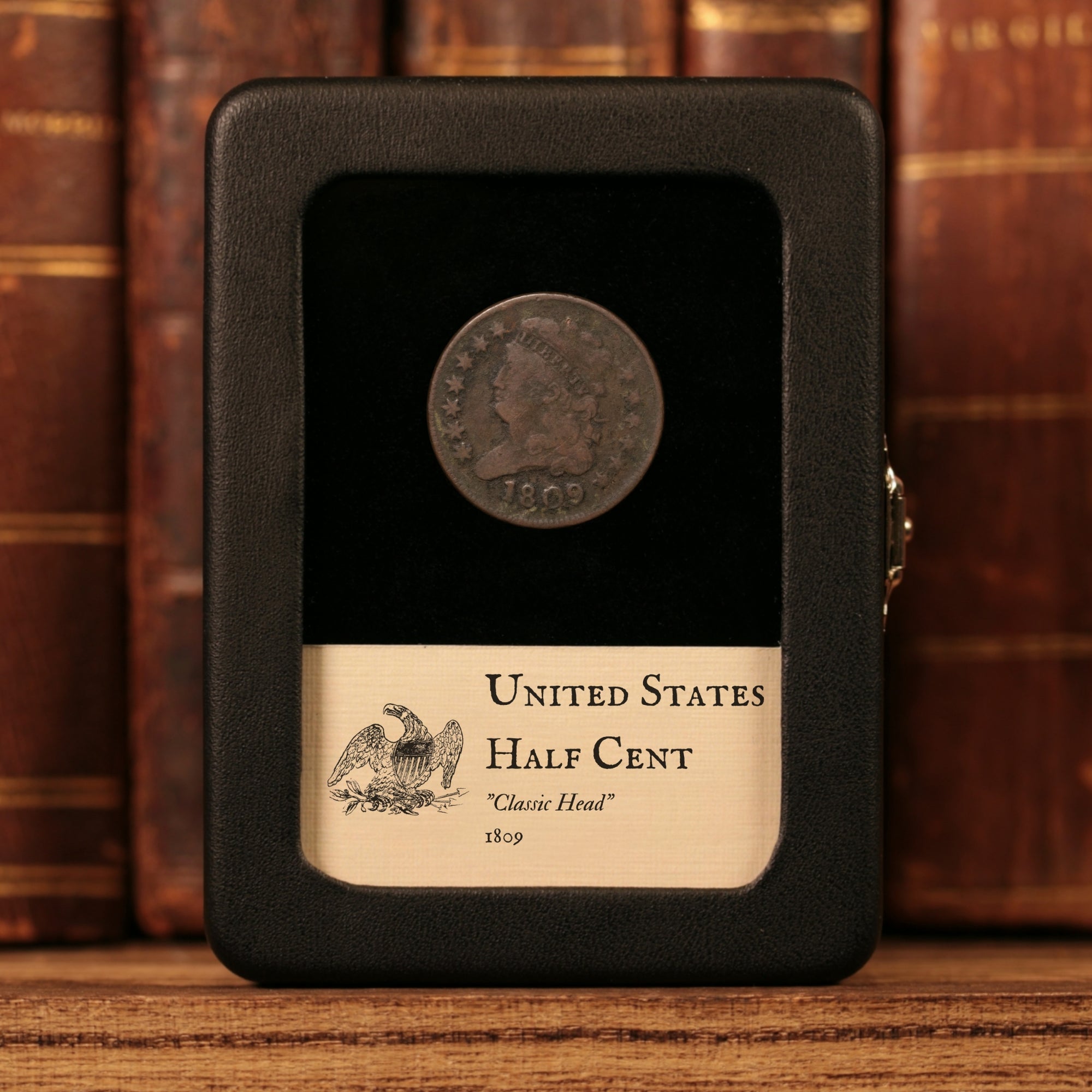 Our original glass and leatherette display boxes showcase your relic above a custom information card, with a design unique to History Hoard.