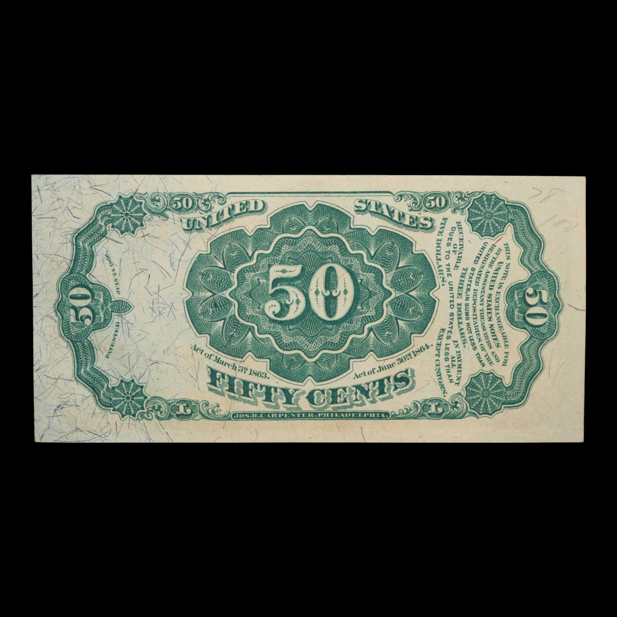 Notes: Fractional currency, also known as shinplasters, were a form of US currency worth less than a dollar in value that were introduced following the start of the Civil War. The term “shinplaster” was coined earlier, during the Revolutionary War. Soldiers would put pieces of paper, typically low-denomination currency notes, inside their boots to cushion their shins against chafing or rash, and due to their low denominations, the Civil War era fractional currency earned the shinplaster nickname.