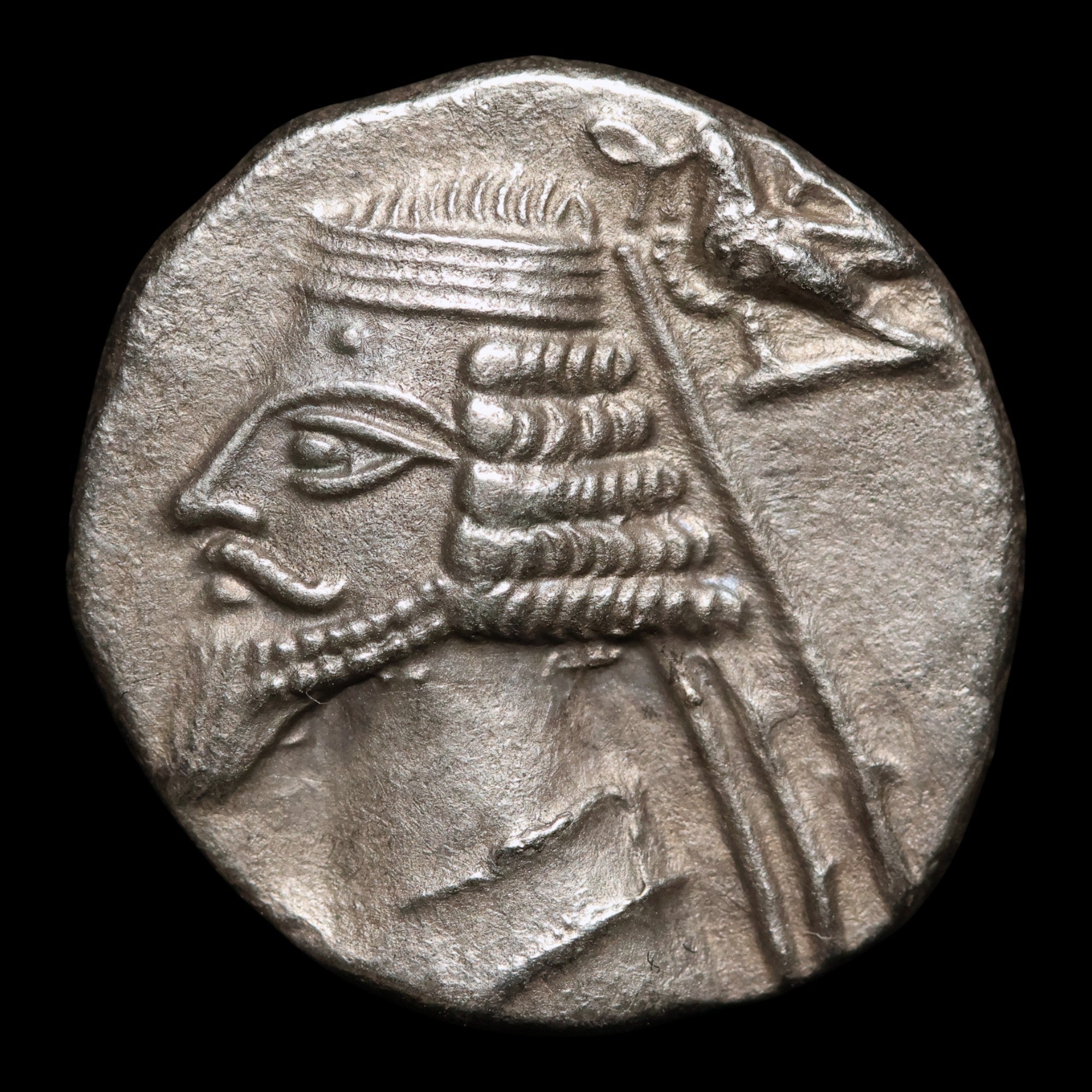 • Obverse: Bare-headed bust of Phraates IV left with royal wart, pointed beard and wearing diadem; eagle behind head crowning king