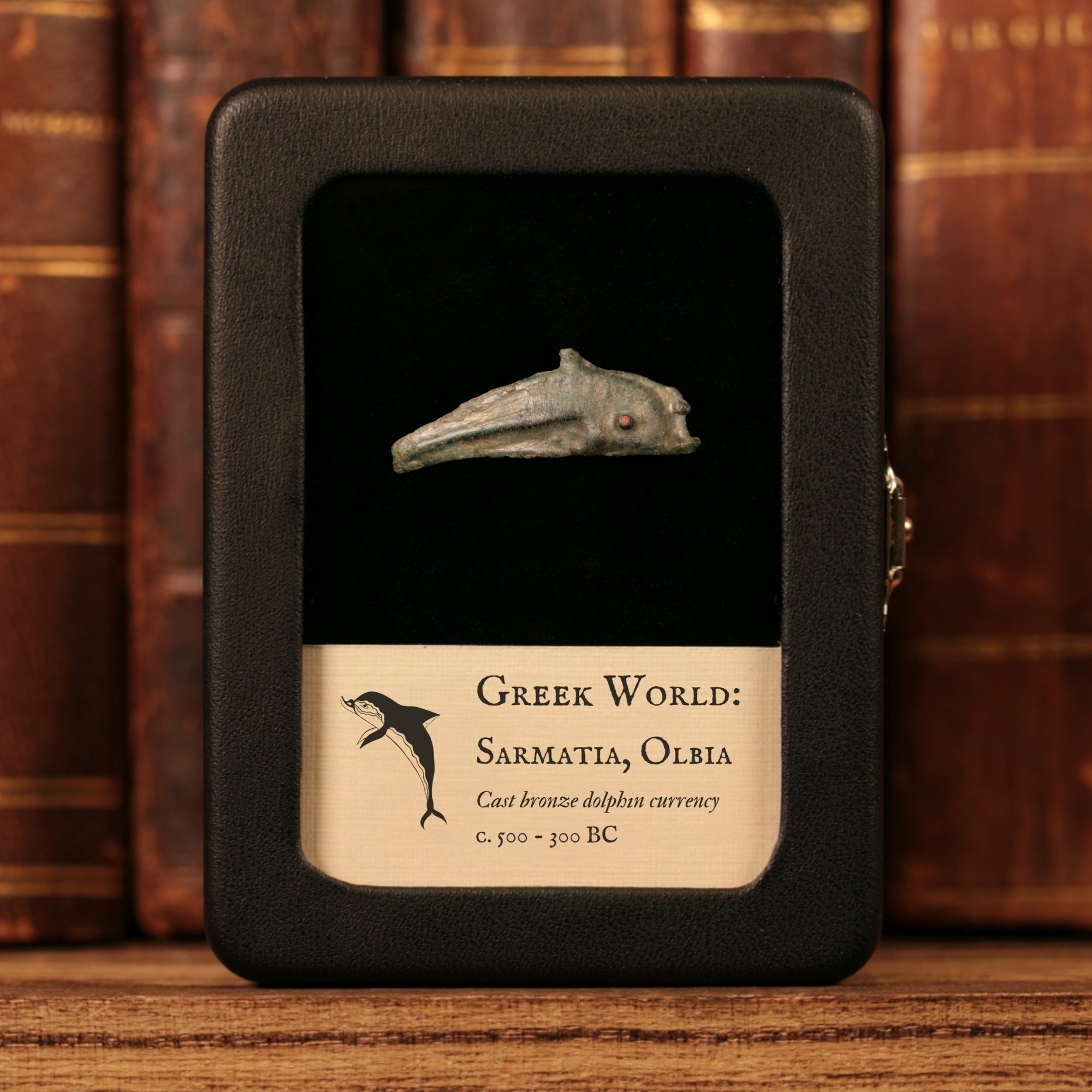 Notes: These pieces of dolphin shaped bronze currency are from the Greek colony of Olbia, located on the northern coast of the Black Sea in modern day Ukraine. Dolphins had an important role in Greek mythology, and the bottle-nosed dolphins that swam in the Black Sea were likely the inspiration for Olbia's uniquely shaped currency. The dolphin "coins" are an example of proto-money, which refers to any commodity that all people in an early society agreed to accept in trade. This could include shells, rings, or other small objects that were easy to find or manufacture in large amounts. The colony of Olbia itself was an important commercial hub for exporting fish, grains, and enslaved people to Greece, as well as importing Greek goods into Scythia. It held this status for about a thousand years, from the 7th century BCE to the 4th century CE.