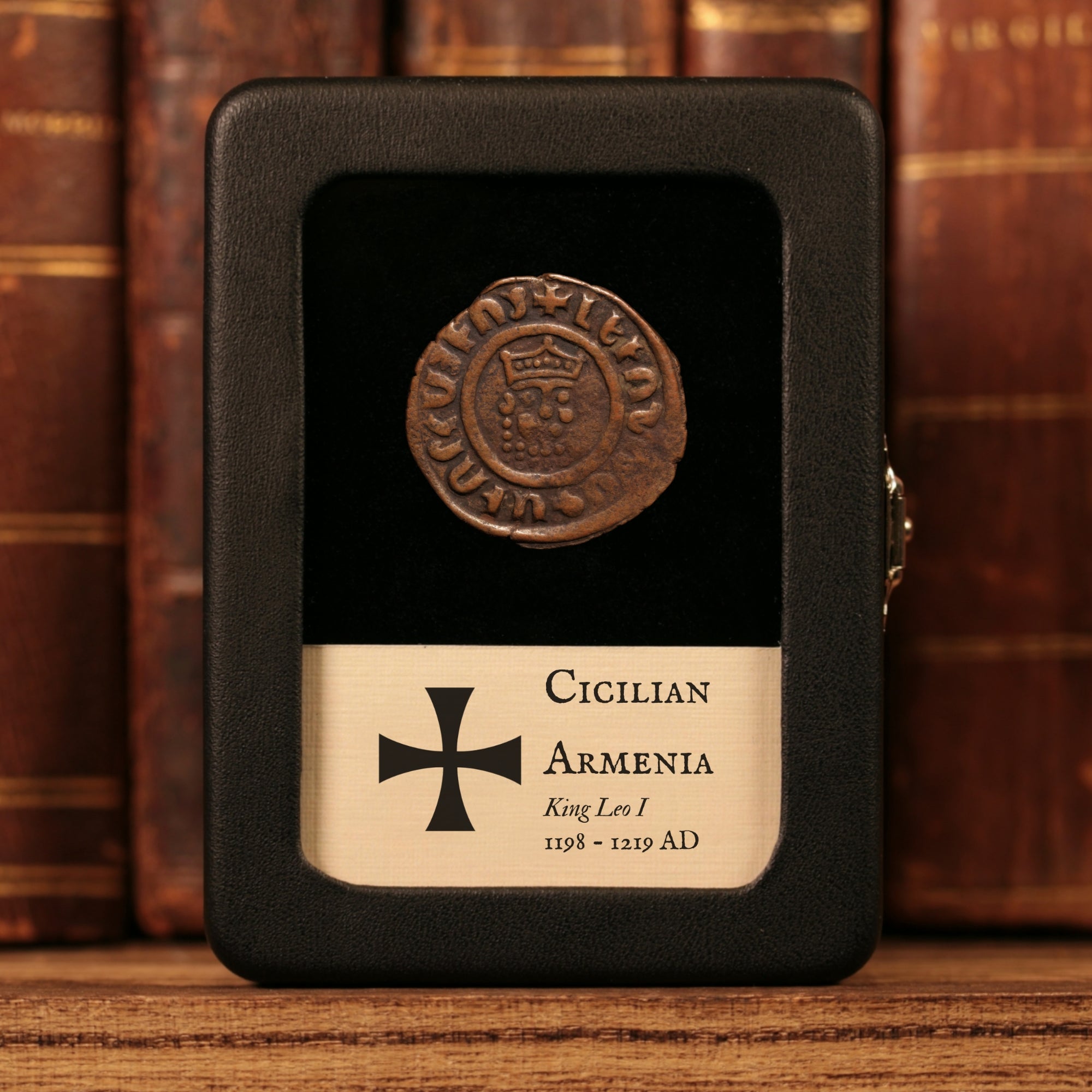 Our original glass and leatherette display boxes showcase your relic above a custom information card, with a design unique to History Hoard.