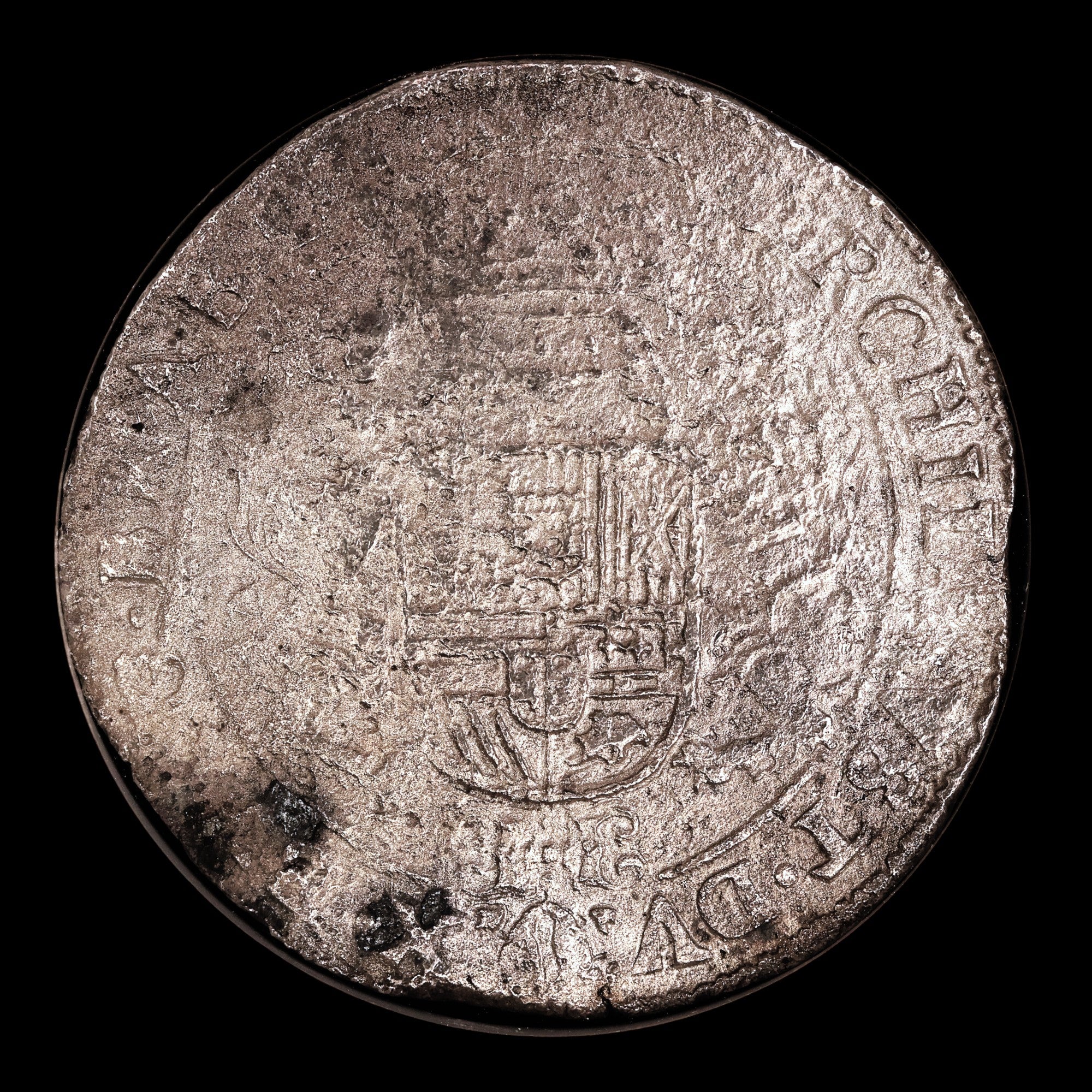 Obverse: PHIL . IIII . D . G . HISP . ET . INDIAR . REX . (Philip IV, by the grace of God, King of the Spains and the Indies) - Armored bust of Philip IV right, mint mark at top.