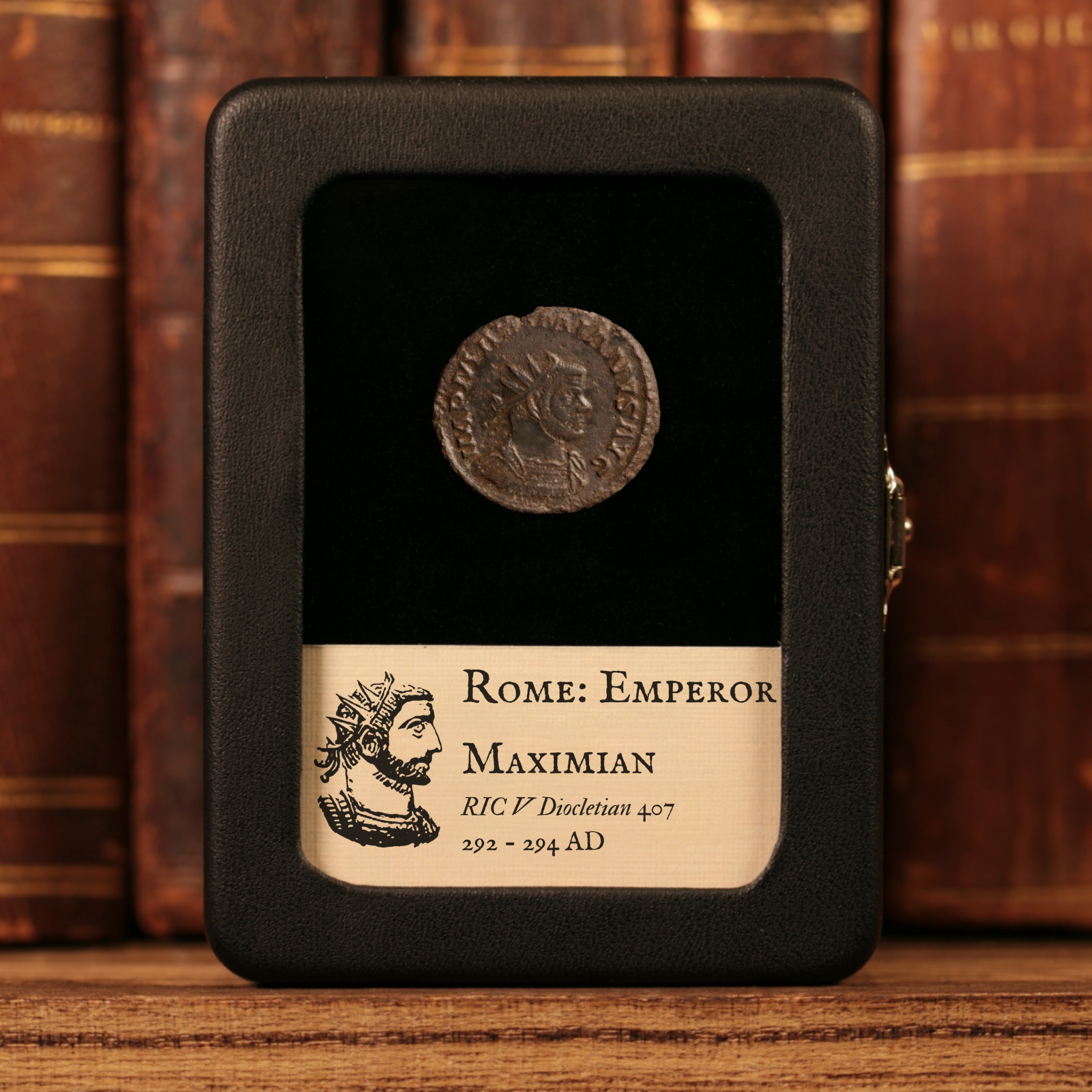 Our original glass and leatherette display boxes showcase your relic above a custom information card, with a design unique to History Hoard.