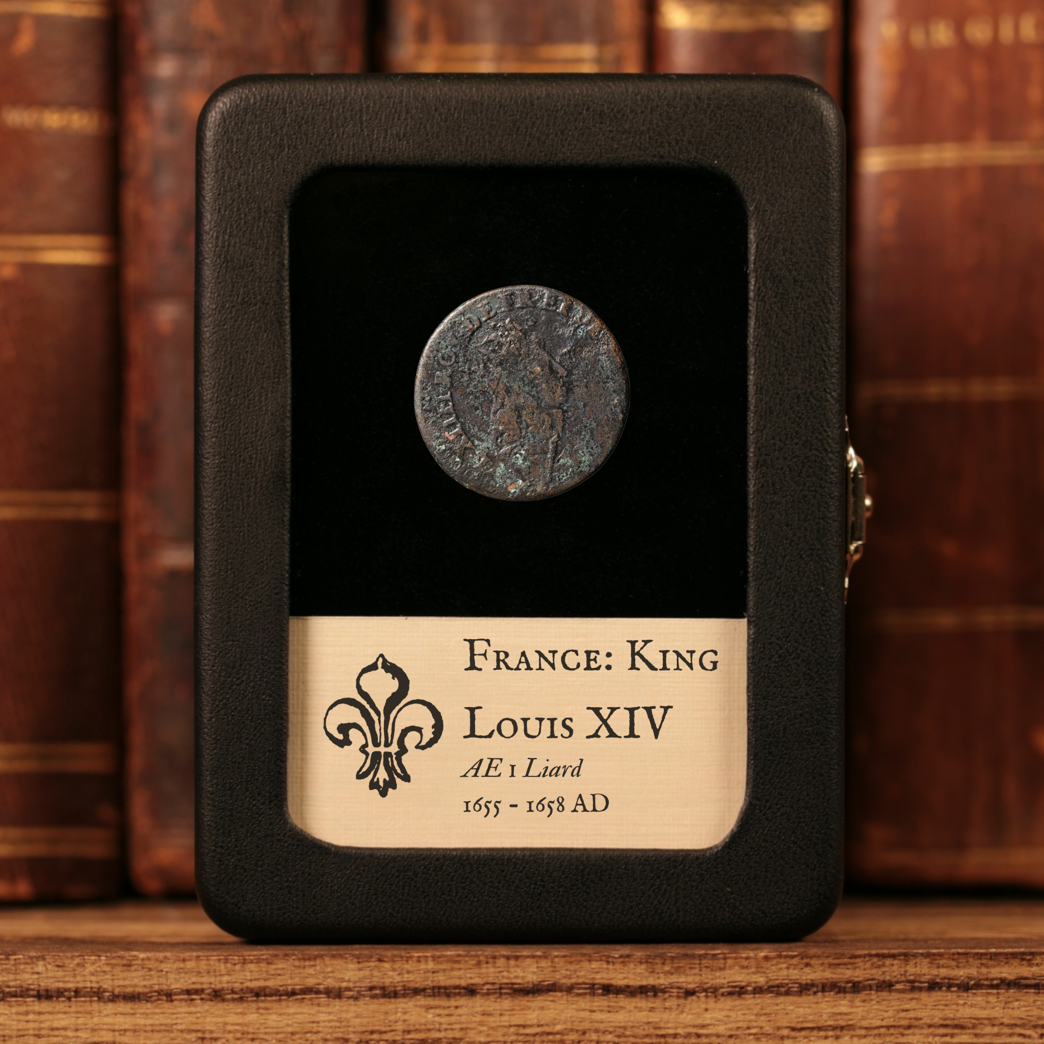 Our original glass and leatherette display boxes showcase your relic above a custom information card, with a design unique to History Hoard.