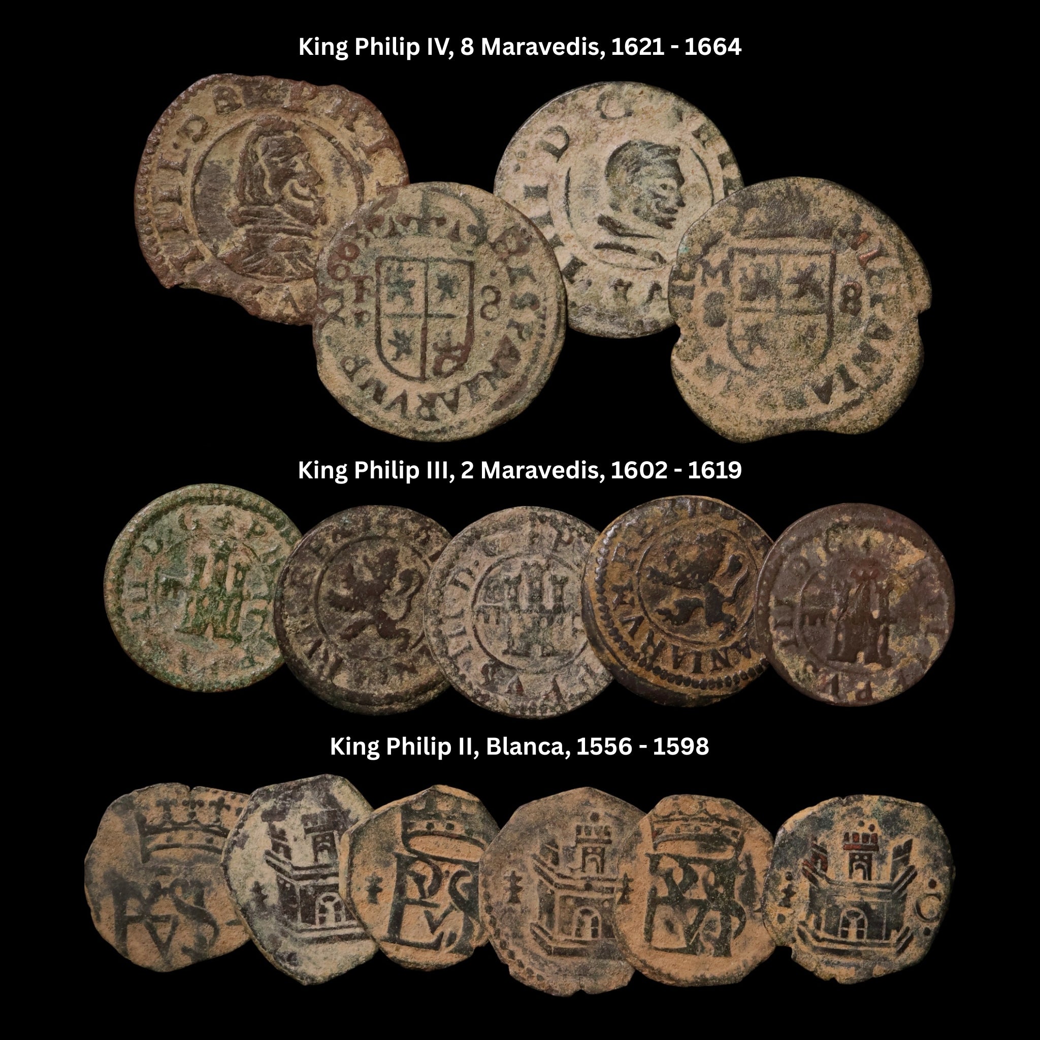 This set brings together three Habsburg dynasty monarchs from Spain’s Golden Age of power and exploration: Philip II (1556–1598), Philip III (1598–1621), and Philip IV (1621–1665). Under Philip II, Spain reached the height of its influence, ruling vast territories across Europe and the New World while overseeing the first truly global empire. His son, Philip III, presided over a more peaceful but financially strained kingdom, marked by court intrigue and costly overseas commitments. Philip IV inherited this declining empire, remembered both for his patronage of great artists like Velázquez and for the wars that eroded Spain’s dominance in Europe. Together, these coins reflect the arc of Spain’s power in the 16th and 17th centuries, from its peak under Philip II to the gradual weakening of its empire under his successors.